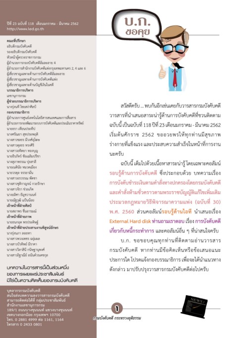 ผู้อำานวยการกองพัฒนาระบบการบังคับคดีและประเมินราคาทรัพย์ ฉบับนี้ เป็นฉบับที่ 118 ปีที่ 23 เดือนมกราคม - มีนาคม 2562