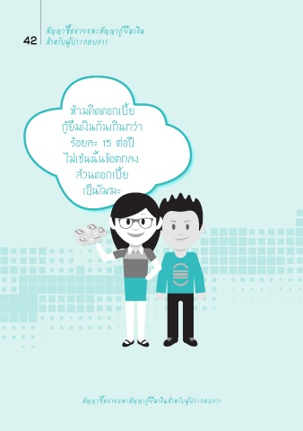 สัญญาซื้อขายและสัญญากู้ ยืมเงิน 42 สํำาหรับผู้ประกอบการ ห้ามคิดดอกเบี้ย กู้ยืมเงินกันเกินกว่า ร้อยละ 15 ต่อปี ไม่เช่นนั้นข้อตกลง ส่วนดอกเบี้ย เป็นโมฆะ สัญญาซื้อขายและสัญญากู้ยืมเงินสํำาหรับผู้ประกอบการ