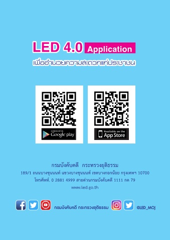 LED 4.0 Application เพื่ออำ�นวยคว�มสะดวกแก่ประช�ชน กรมบังคับคดี กระทรวงยุติธรรม 189/1 ถนนบางขุนนนท์ แขวงบางขุนนนท์ เขตบางกอกน้อย กรุงเทพฯ 10700 โทรศัพท์. 0 2881 4999 สายด่วนกรมบังคับคดี 1111 กด 79 www.led.go.th กรมบังคับคดี กระทรวงยุติธรรม @LED_MOJ