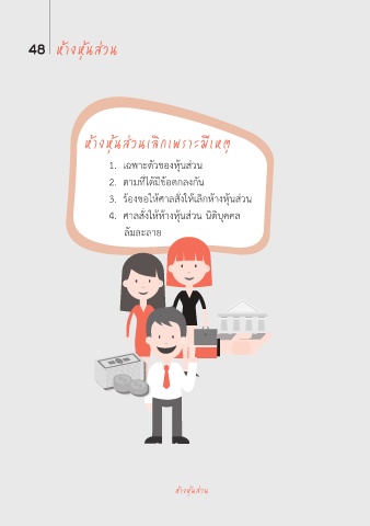 48 ห้างหุ้นส่วน ห้างหุ้นส่วนเลิกเพราะมีเหตุ 1. เฉพาะตัวของหุ้นส่วน 2. ตามที่ได้มีข้อตกลงกัน 3. ร้องขอให้ศาลสั่งให้เลิกห้างหุ้นส่วน 4. ศาลสั่งให้ห้างหุ้นส่วน นิติบุคคล ล้มละลาย ห้างหุ้นส่วน