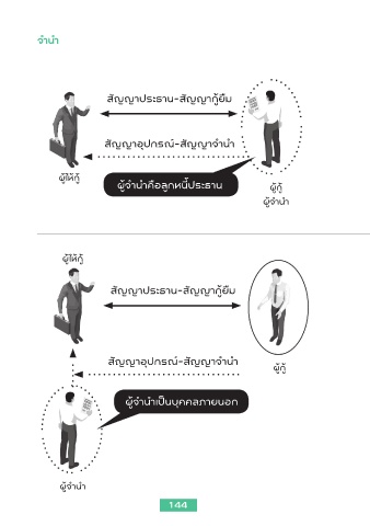 จำานำา สัญญาประธาน-สัญญากู้ยืม สัญญาอุปกรณ์-สัญญาจำานำา ผู้ให้้กู้ ผู้จำานำาคือลูกหนี้ประธาน ผู้กู้ ผู้จำานำา ผู้ให้้กู้ สัญญาประธาน-สัญญากู้ยืม สัญญาอุปกรณ์-สัญญาจำานำา ผู้กู้ ผู้จำานำาเป็นบุคคลภายนอก ผู้จำานำา 144