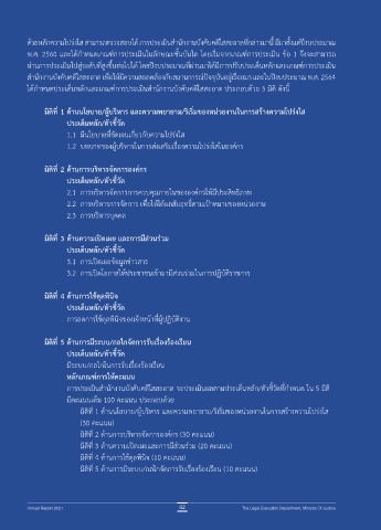 ได้ก�าหนดประเด็นหลักและเกณฑิ์การประเมินส�านักงานบังคับคดีใสสะอาด ประกอบด้วย 5 มิติ ดังนี้